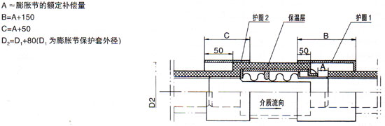 直埋式膨脹節(jié)(不包括一次性直埋式)安裝時(shí)應(yīng)有兩個后年度護(hù)圈(如下圖),且護(hù)圈的壁厚不應(yīng)小于管道的壁厚,設(shè)置護(hù)圈1的目的是為管道受熱膨脹時(shí),A尺寸范圍內(nèi)有土、砂等進(jìn)入,圖中的各尺寸為: